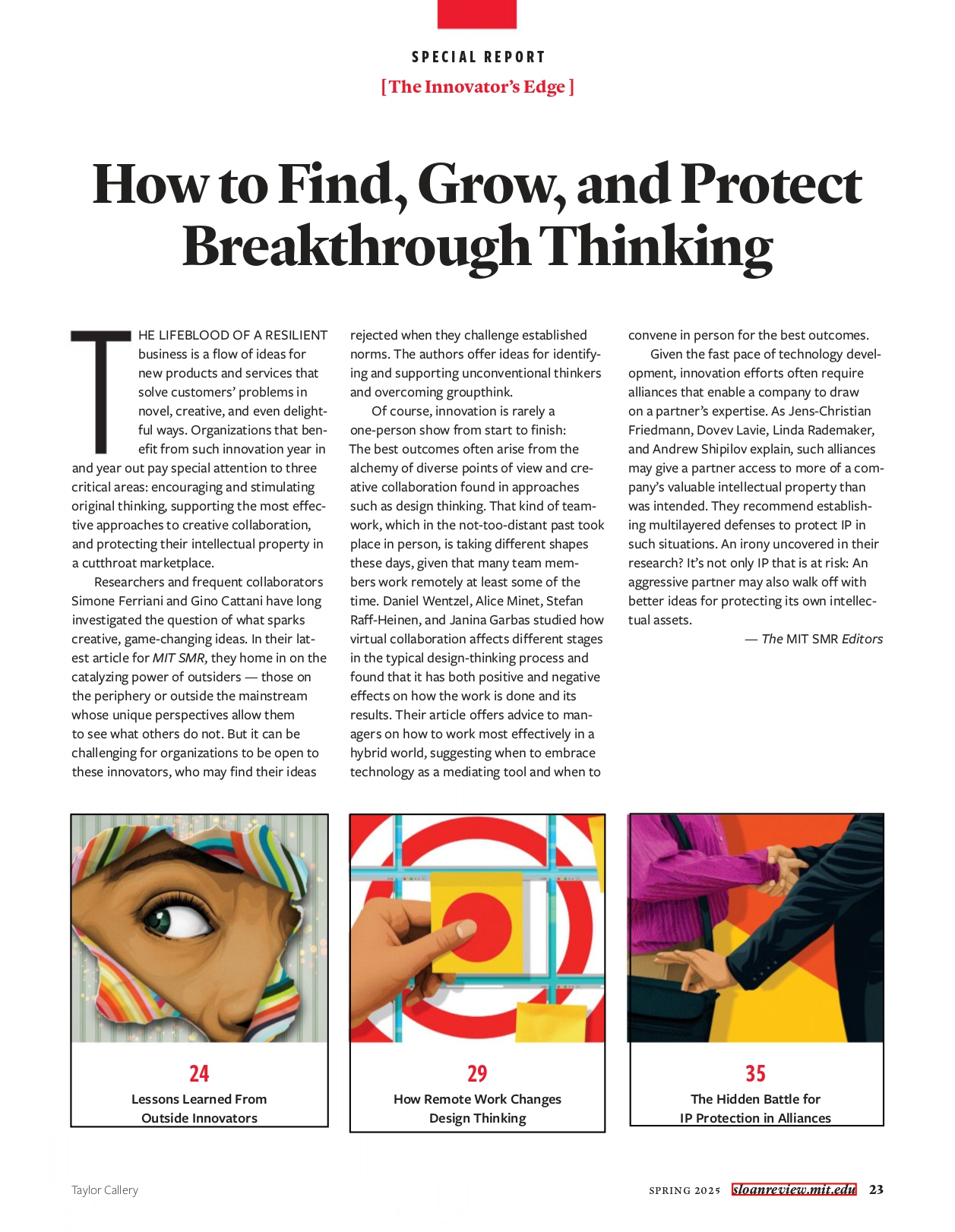 Este documento de resumen sintetiza los temas principales e ideas importantes presentadas en los extractos proporcionados de la edición Primavera 2025 de MIT Sloan Management Review, centrados en el informe especial titulado «El Ventaja del Innovador». Los extractos exploran diferentes facetas del fomento y protección del pensamiento innovador, incluyendo el aprovechamiento de perspectivas externas, la adaptación del diseño de pensamiento para el trabajo remoto y la navegación de los riesgos de robo de propiedad intelectual (PI) en alianzas.